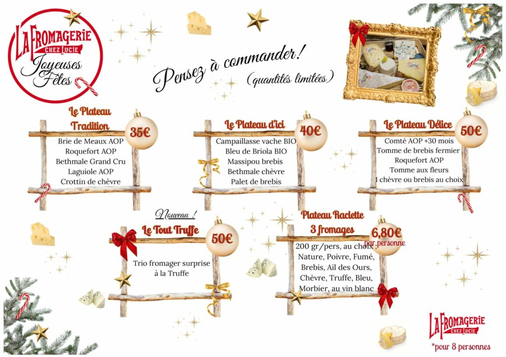 Pour les Fêtes, Lucie vous propose des plateaux de fromage pour la fin du repas ou des plateaux de fromage à raclette (200 gr/personne), pensez également aux mélanges pour fondue savoyarde (300 gr/personne).